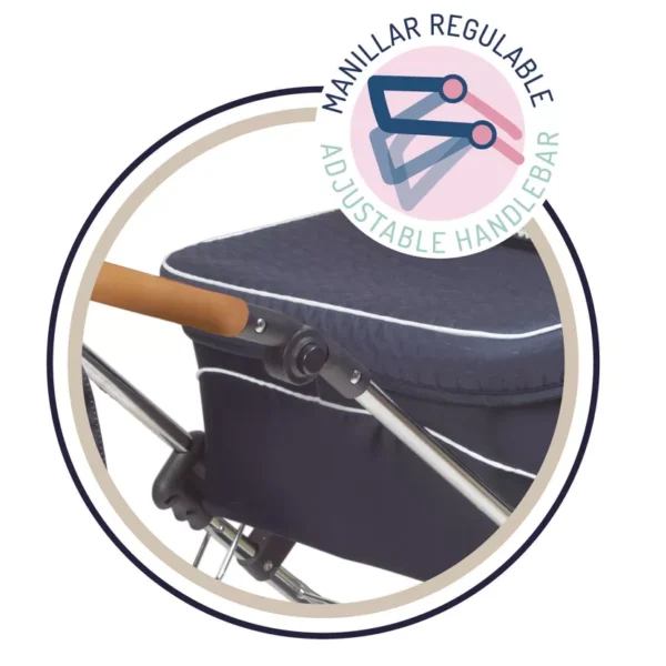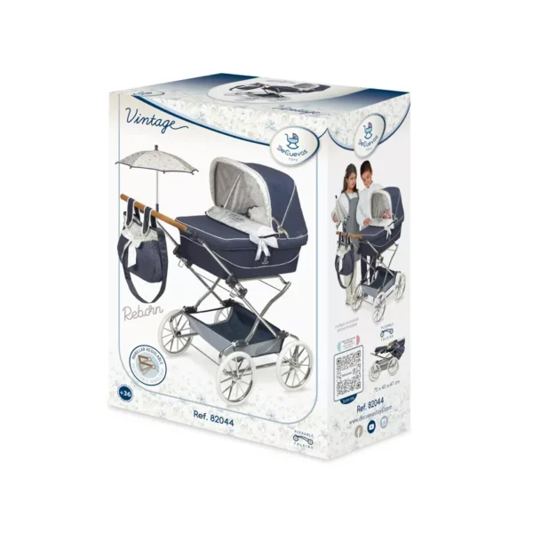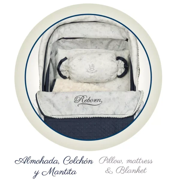 Folding REBORN doll car with suspension. Includes bag, umbrella, padded fabric, storage tray, height-adjustable handlebar (maximum 90 cm), hood with tensioners, mattress, pillow and blanket. THE INTERIOR MEASUREMENT OF THE BASKET is 53x32cm.