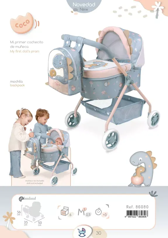 My first doll car. Quilted fabric. Backpack with dinosaur detail in terry cloth and felt crest, storage tray, and dinosaur transfer on the cover. Mattress included. INTERIOR BASKET MEASUREMENT: 41x24cm.