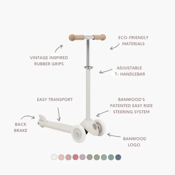 This pack includes the ECO Scooter with the ECO helmet in matching color. 1. ECO SCOOTER The Eco Scooter is crafted entirely from 100% post-consumer recycled plastic. The eco scooter is designed to grow with your child, this scooter not only promotes balance and coordination but also embodies our dedication to reducing environmental impact through thoughtful design. A perfect blend of functionality and sustainability, it encourages adventure while contributing to a greener planet for future generations. ECO SCOOTER PRODUCT DETAILS • Suitable for children aged 3+ • Patented Easy Ride Steering System for smooth control • Quick-release spring pin for easy handlebar detachment and transport • Adjustable T-handlebar with 3 heights: 70, 75, 80 cm • Wide, anti-slip deck (29.3 × 10 cm) for stability and comfort • Strong frame supports up to 50 kg • Three-wheel design with rear brake for safety • Non-slip rubber grips with rounded ends for secure hold • Lightweight at 2.54 kg, easy for kids to ride and parents to carry 2- ECO HELMET The Eco Helmet is a kids helmets designed with a matte finish are the ideal for the smallest ones to keep safe when joining in for a ride. Our children’s Eco helmets are available in one size and have a dial-fit adjustment system in the back and the adjustable chin strap, which provides an exact fitting of the helmet, for maximum comfort and secure fit. ECO HELMET PRODUCT DETAILS • Age Range: Suitable for children 3+ years. • Shell Material: Durable ABS shell made from recycled materials. • Inner Lining: Protective foam for enhanced safety. • Adjustment System: Dial-fit for a comfortable, secure fit. • Weight: Lightweight design at 355 g. • Size Range: Fits head circumferences of 50–54 cm. • Chinstrap: Adjustable strap made from recycled materials. • Ventilation: Front, top, and back openings for airflow. • Design: Banwood logo printed on the front. • Certification: CE Marked for safety compliance.