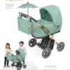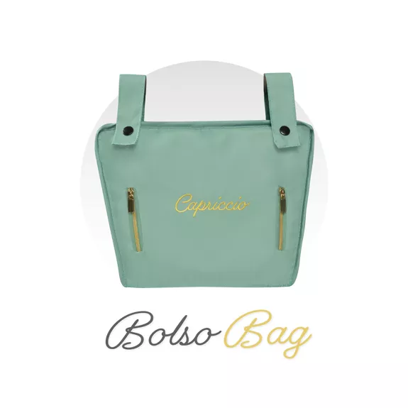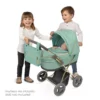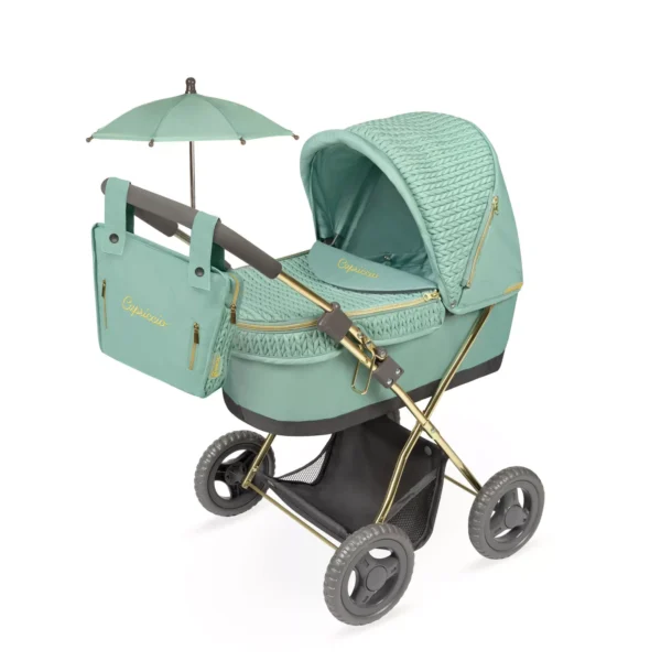 Foldable doll’s stroller, including mattress, bag with chrome zippers, parasol and storage tray. Plain fabric combined with quilted fabric with a braided look. Part of the structure is chrome. THE INTERIOR MEASUREMENT OF THE BASKET is 48x26cm.