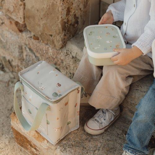 Go on an adventure with this fun cooler bag with Little Farm print. This sturdy canvas cooler bag has an insulating interior to keep your lunch, snacks, and drinks wonderfully cool for a picnic, at school, or on the go. The main compartment of the cooler bag has enough space for a lunchbox, drinks, and, for example, a piece of fruit. You could store a cookie in the front pocket. You can easily take the bag anywhere with the handles. Where will you take the cooler bag?
