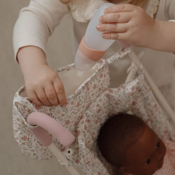 This metal doll buggy is perfect for adventures with your baby doll. With a sturdy off-white frame, pink details and a seat in the cheerful Soft Flowers design, this buggy is not only practical, but also beautiful to look at. The safety belt ensures that your doll stays firmly in place, even during the wildest walks. A handy storage bag on the handle offers space for doll items, so that you have everything at hand for a nice day on the road with your doll.