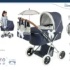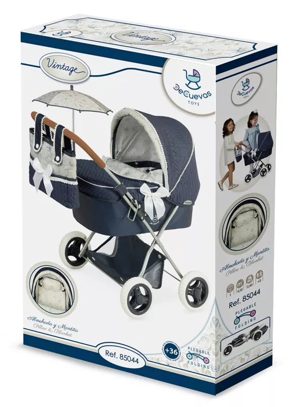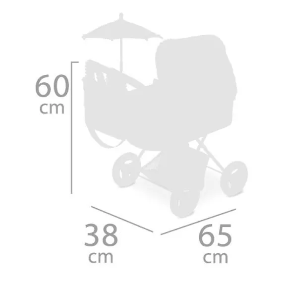 Doll car with bag, umbrella and storage tray. Padded fabric. Also includes mattress and pillow. THE INTERIOR MEASUREMENT OF THE CARRYCOT is: 48x26cm. The chassis is foldable.