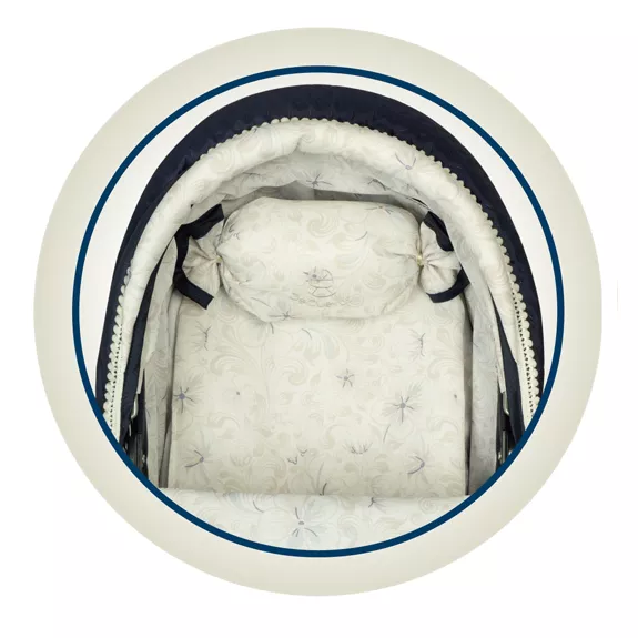 Doll car with bag, umbrella and storage tray. Padded fabric. Also includes mattress and pillow.