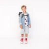Open the Velcro fastener and unfold the back panel. Adjust the back straps on the stabilizing aluminum frame to the correct size for your child by moving the black arrow. Remove the instruction card and fasten the back straps.