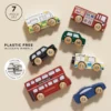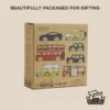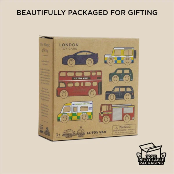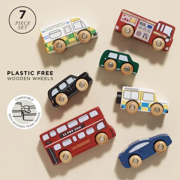 Comprising 7 iconic London vehicles; a double decker bus, black taxi, fire engine, police van, ambulance and 2 sporty cars – compatible with wooden train tracks