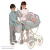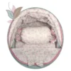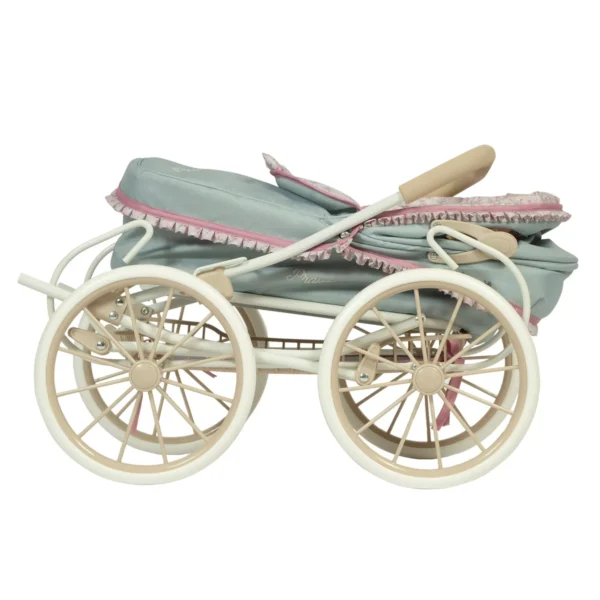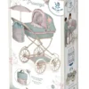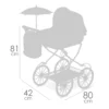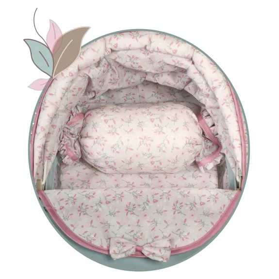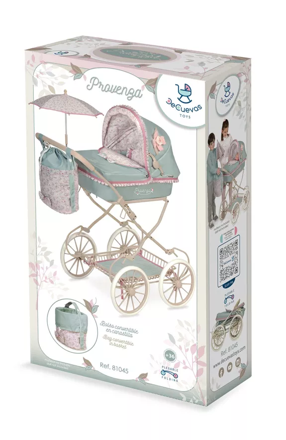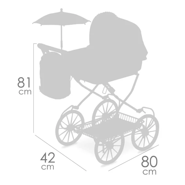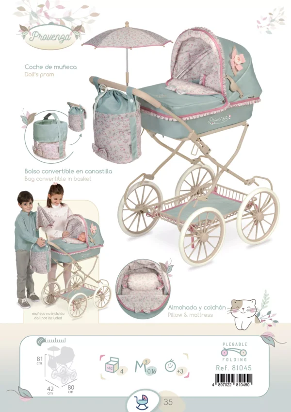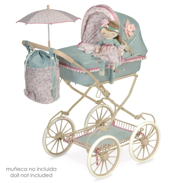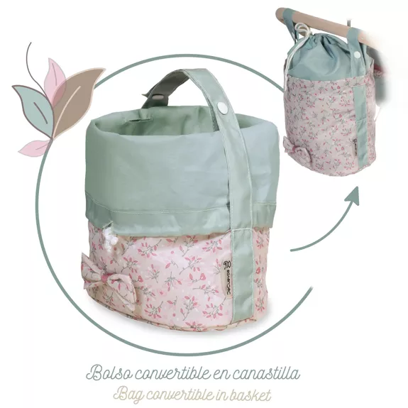 Foldable stroller with suspension, umbrella and convertible basket bag. Quilted fabric, hood with tensioners and fabric flower detail. Includes mattress, pillow and fabric-lined plastic storage tray. THE INTERIOR MEASUREMENT OF THE BASKET is: 47x25cm.