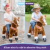 Different from bikes, our ponies allow kids to sit on the horse back saddle with two feet on the pedals instead of on the ground. Here we go!