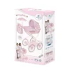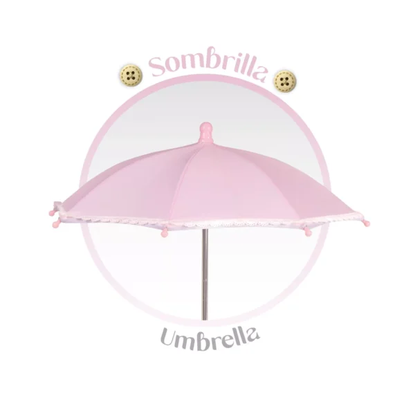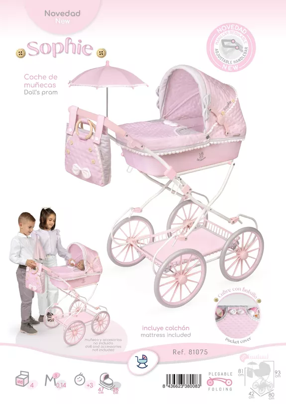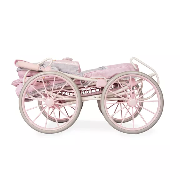 Foldable doll’s stroller with suspension and padded fabric. Beautiful padded bows, embroidered details and decorative buttons in natural wood. The handlebar is height-adjustable and the hood has tensioners. The cover offers the possibility of storing small accessories in its pocket. Includes umbrella, mattress, bag with natural wood handles and fabric-lined plastic storage tray. THE INTERIOR MEASUREMENT OF THE BASKET is 47x25cm.