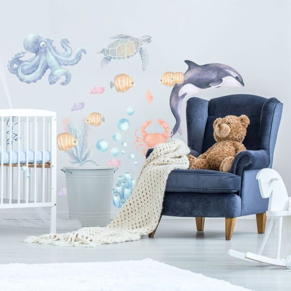The collection of ocean wall stickers was created for lovers of life pulsating under the surface of the water. Hand-painted stickers from this series are beautiful, sea views and ocean depths full of fish, seaweed, crabs and shells. The entire series has been designed to perfectly harmonize with each other and create a coherent composition.