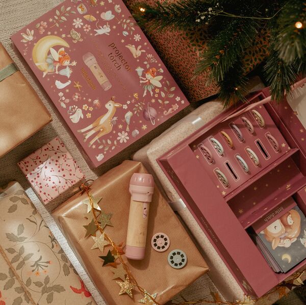 The projector flashlight has a sturdy wooden handle and works on batteries, so it can be taken anywhere. After the story, you can easily store the flashlight and all accessories in the beautiful storage box. Perfect for children who love to discover and experience stories.