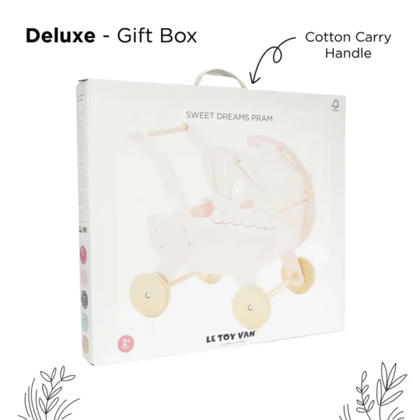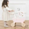 Featuring a soft pastel pink, cream and fresh white colour palette, it’s strong structure, soft padded mattress and unique retractable hand-sewn canopy makes it the perfect pram to take soft toys and dolls out in style.