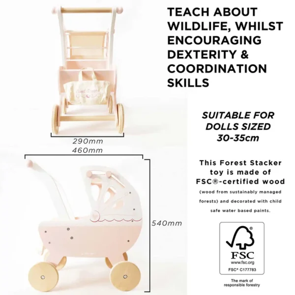 Take dolly out and about on all their childhood adventures, with our beautiful, traditional wooden doll pram stroller.