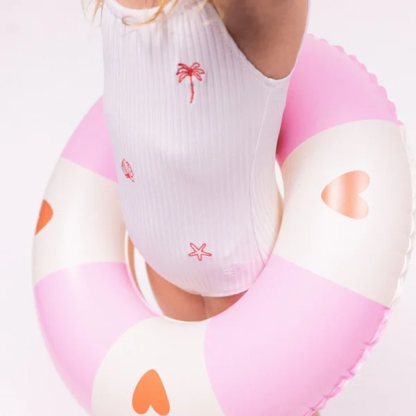 Adorable swim ring in a delightful pink cozy hearts print, providing a fun and secure floating experience for your little one, perfect for splashing around and making joyful summer memories!