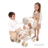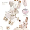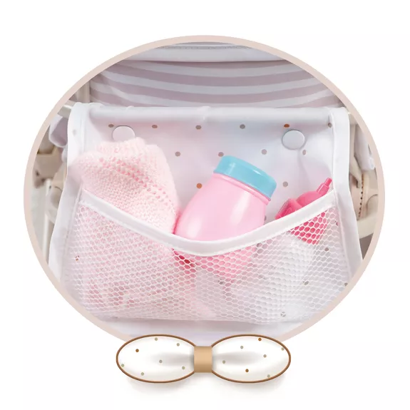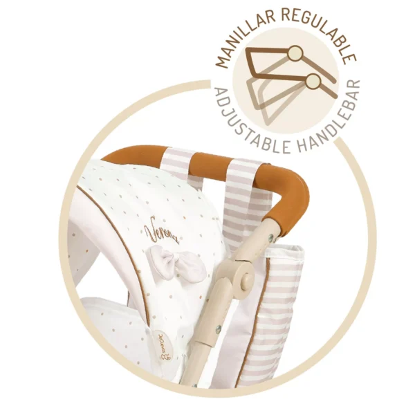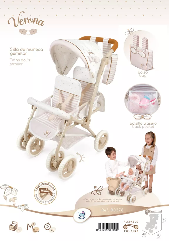 GEMELAR folding doll’s chair with hood and height-adjustable handlebar (maximum 72 cm).)Includes bag, storage tray, double SWIVEL front wheels and harness-type safety belts.Bow detail and embroidery on the hood. Includes back pockets. The maximum recommended size for dolls would be 52cm.