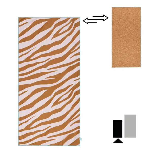 A lovely summery Orange Vibrant Stripes print, doesn’t it just scream summer? A beach towel is a must-have for the pool or the beach. This Microfiber Beach Towel is made from 100% recycled microfiber, making it quick-drying and super soft. The front features a Vibrant Stripes print, while the back has a cozy polka dot design. You can flip it over for a bit of variety! The towel measures 135 x 65 cm. It’s also available in a larger size: 180 x 90 cm.