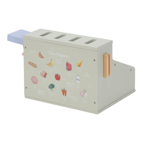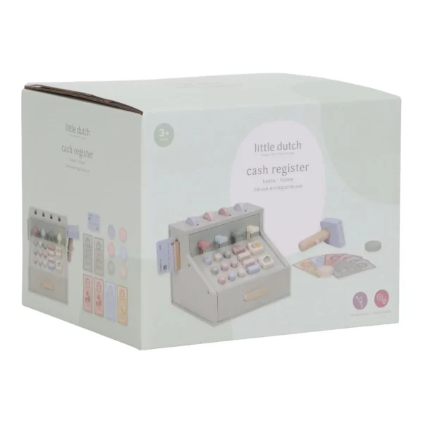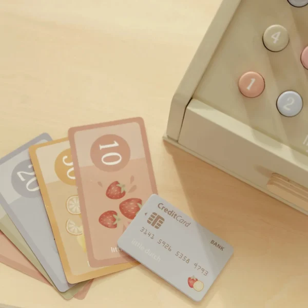 Calculating, scanning, and checking out! With this wooden cash register, playing shop feels even more real. The register is equipped with a scanner, a card reader, buttons, and a cash drawer for coins and bills. It also includes a debit card, so customers can pay both in cash and by card. A fantastic way to playfully engage with money and numbers. What will it be today?