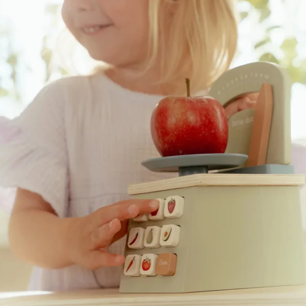 A perfect ingredient for any little kitchen! With this wooden play scale, little bakers and chefs can weigh their ingredients precisely. Place the products on the scale and watch how the needle indicates the weight. The scale has real knobs with illustrations, making playtime in the kitchen even more realistic. Perfect to combine with the play kitchen and baking set for endless play fun!