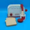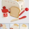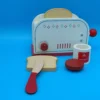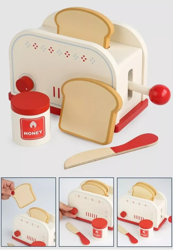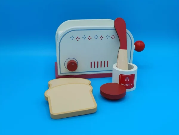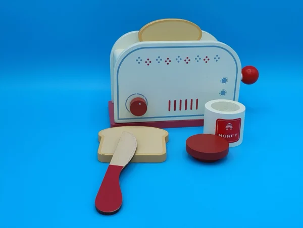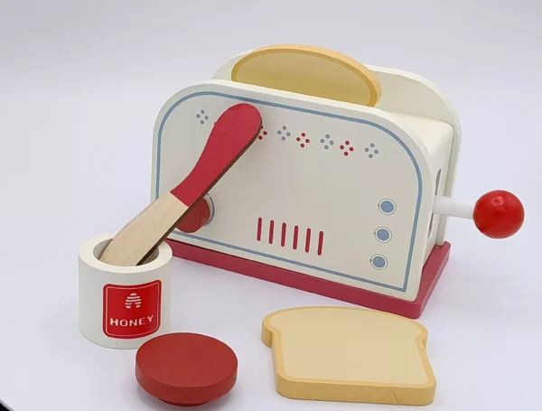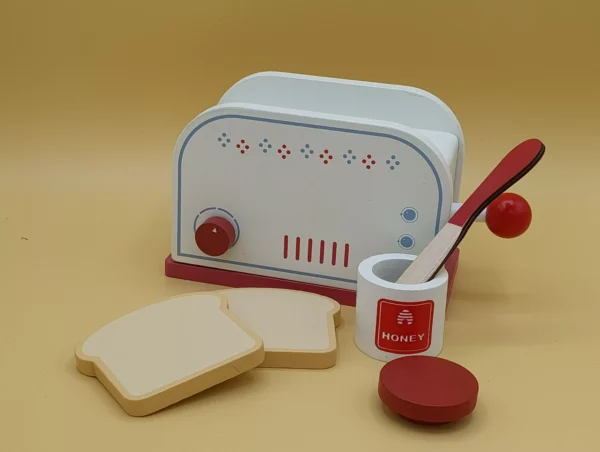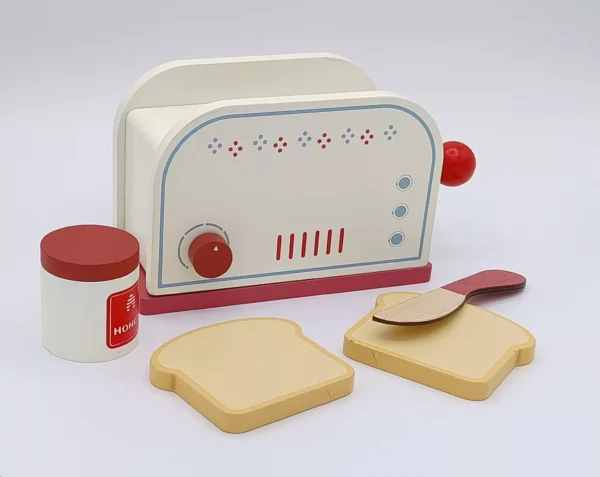 The toaster set with accessories makes children’s games even more realistic; including two slices of bread, a knife and a honey jar with a removable lid.